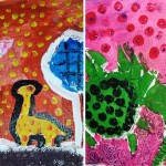 Book Making inspired on medieval Books of Hours – to make these books we researched the covers of Medieval Books and Illuminations. Before students started to cut and glue shapes, they created their designs on paper. They planned, they experimented and they made decisions. For the covers: two 6″x 6″ (15 cm x 15 cm) of 0.078″ (2 mm) cardboard per student, for the covers two 6″x 6̸